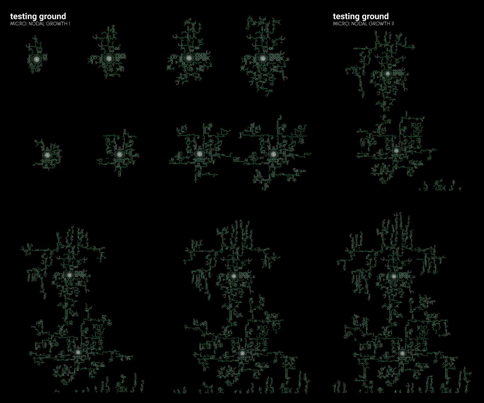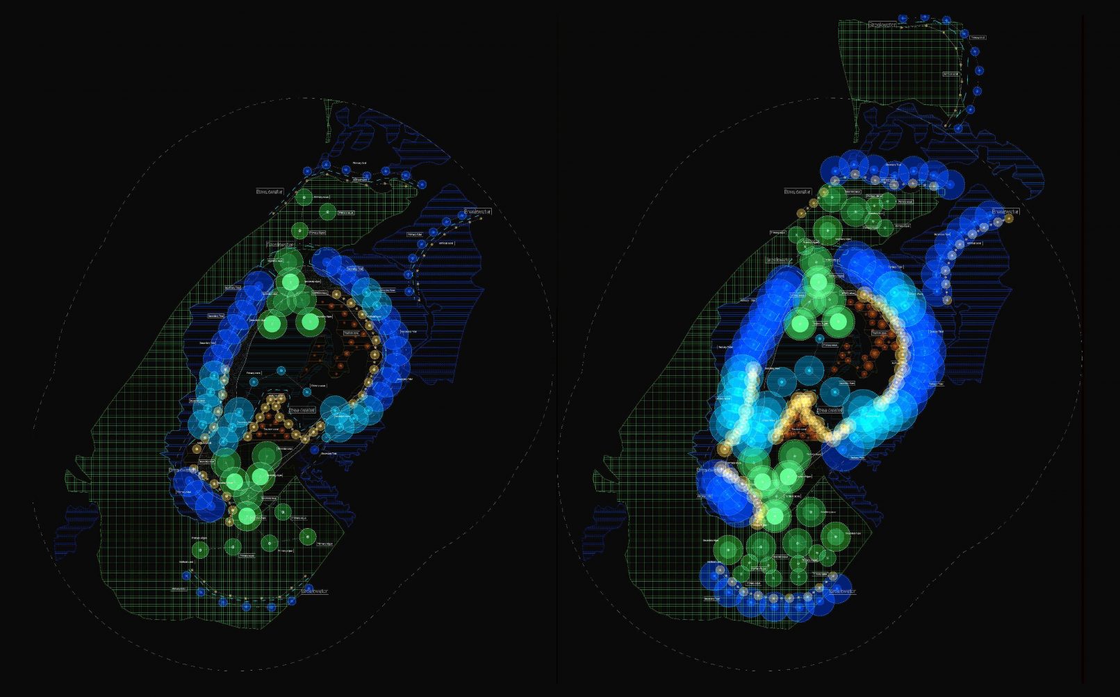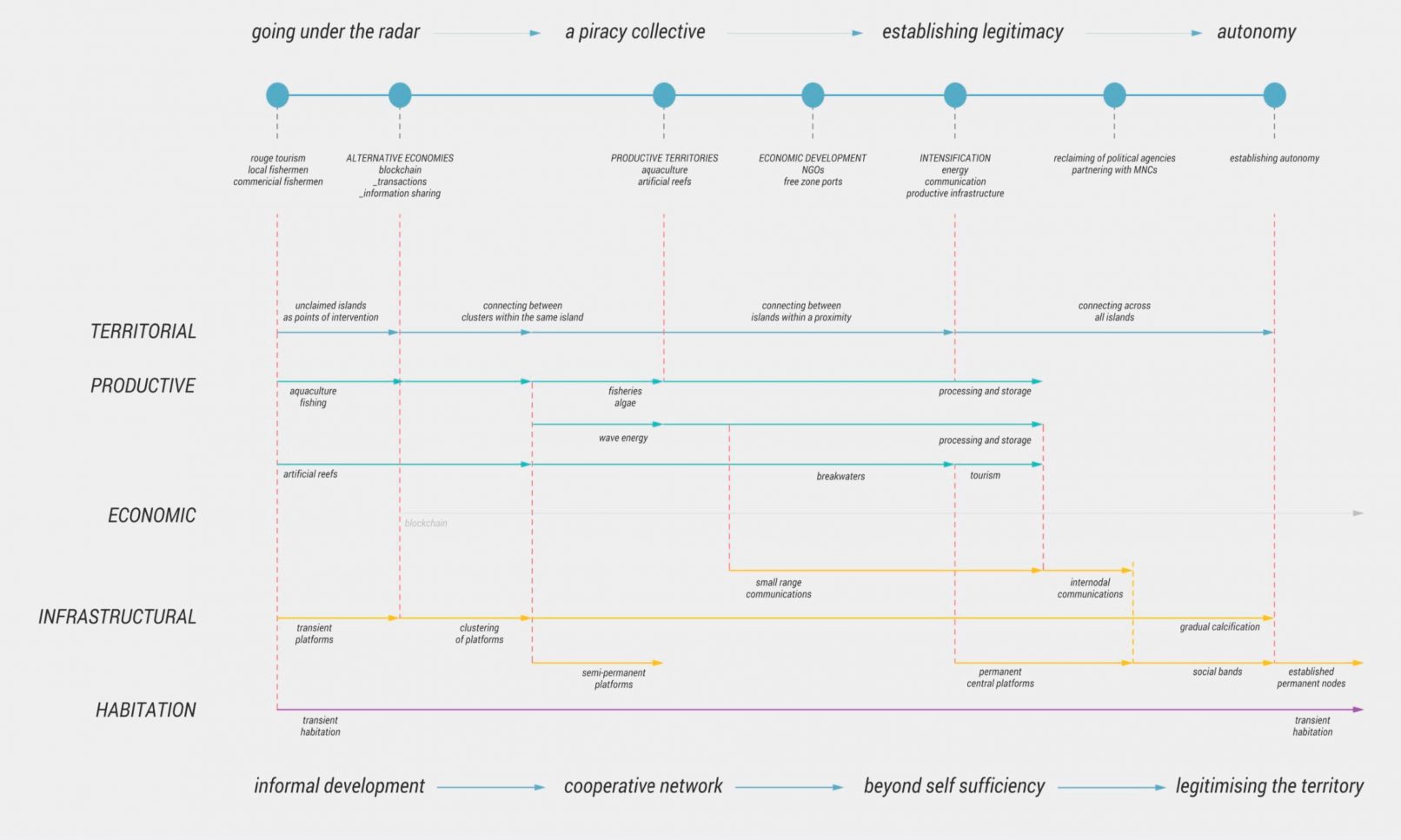 [Establishing the territory] [MACRO: PHASE 1] At the start, small scale nodes and networks begin to form by the fishermen as part of the rogue economy setup to circumvent restrictions placed by the countries in the territory. These connections take place within the islands and reefs with low bathymetry, where the boats and initial infrastructure can be laid without much difficulty. [MACRO: PHASE II] In the second phase, new nodes and cross-island connections are established as the fishermen develop a more comprehensive trade and production system in line with the intensification of infrastructure and communications. In addition to that,, the development of the rogue market attracts more agents such as shippers, traders, and costal natives into the region. [MACRO: PHASE III] In the third phase, the influx of investments from MNCs and legitimization of the rogue market leads to a proliferation in production intensive zones in the region, with infrastructure for algae growth, energy processing, and tourism being developed. [MACRO: PHASE IV] The multiplier effect of investments and development of productive infrastructure leads to the further proliferation of permanent nodes in the areas as well as more zones on intensive production. Connectivities between the nodes and intensive regions also become more comprehensive and complex.
