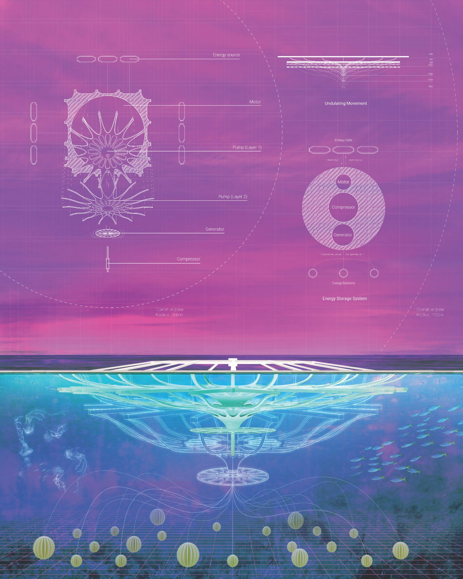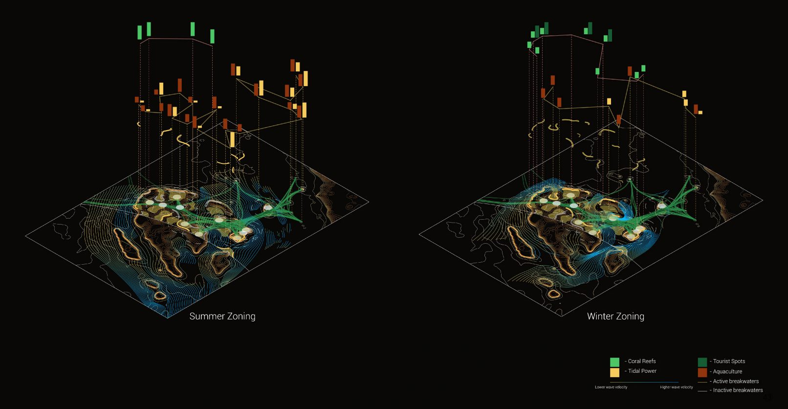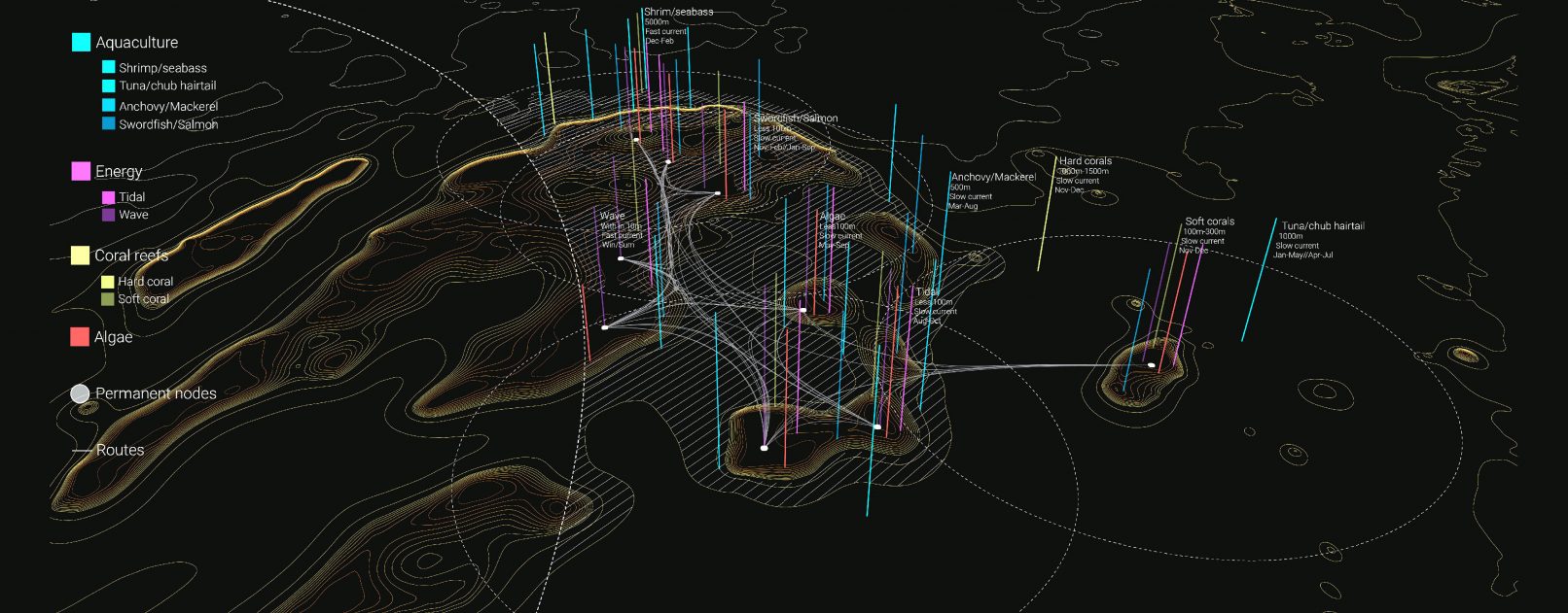 “Bioscapes” reimagines an alternative maritime condition where production and operation are not tied down by the rigidity of infrastructure and ownership but rather encapsulate the fluid and transient state of the sea. That is, that a form of hyper-productive nomadism is made possible through the identification of macro-scale nodes and connectivities based on the given seasonal condition and the implementation of dynamic shifting infrastructure that operates within those nodes. No longer should our live-hood be tied towards the ground, but set free to roam as part of this autonomous and mobile ecology.