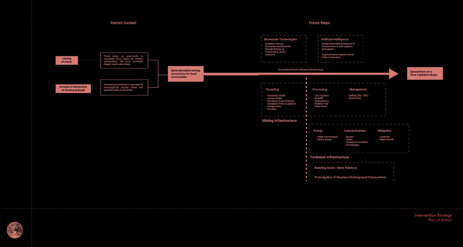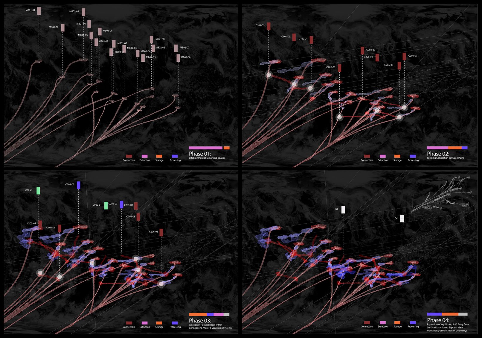 [Students’ Text] Looking into the start and end points of the Capitalocene, namely the extractive processes involved in obtaining minerals to fuel contemporary lifestyles, and the intensifying amounts of scrap produced by the obsolescence cycle of these consumer goods, Philippines provides an interesting paradigm as both state with significant potential in untapped mineral resources, as well as related infrastructure and industries existing in a state of uncertainty. Shifting topographical landscapes, political agency, and the segregation of municiplicities and patchwork communities (not to mention the physical isolation inherent in an archipelagic state) brings forth layers of complexity to the situation at hand. This project aims to use this opportunities to design prototypical infrastructure that redefines the processes of extraction, production, and re-use, and to speculate on the relationship between man, nature, and the machine post-capitalism.